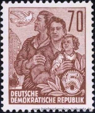1957, Freimarken: Fünfjahrplan70 (Pf) - Familie, Hochhaus an der Weberwiese, BerlinWasserzeichen 3 X, gezähnt K 14Einzelmarke, postfrisch