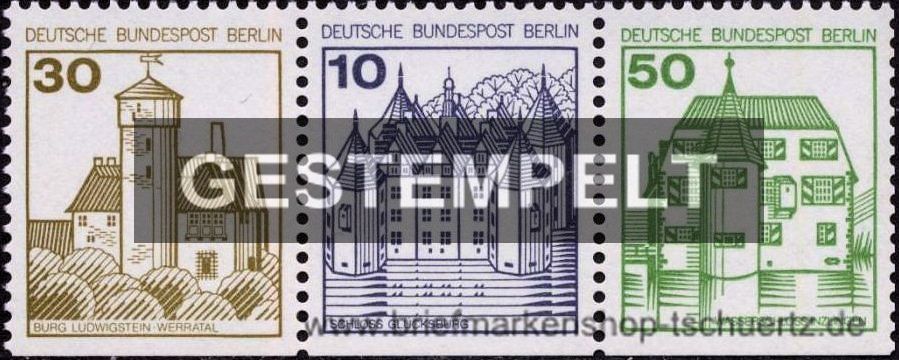 1980, Burgen und SchlösserMiNr. 534 D + 532 D + 615 D / 30 (Pf) + 10 (Pf) + 50 (Pf)Zusammendruck / waagrechter Dreierstreifen, gestempelt