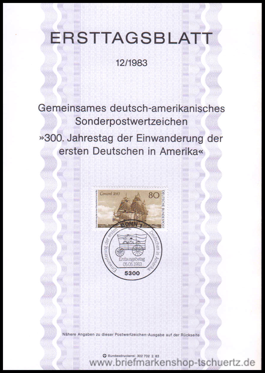 1983, 300. Jahrestag der Einwanderung der ersten Deutschen in Amerika Ersttagsblatt