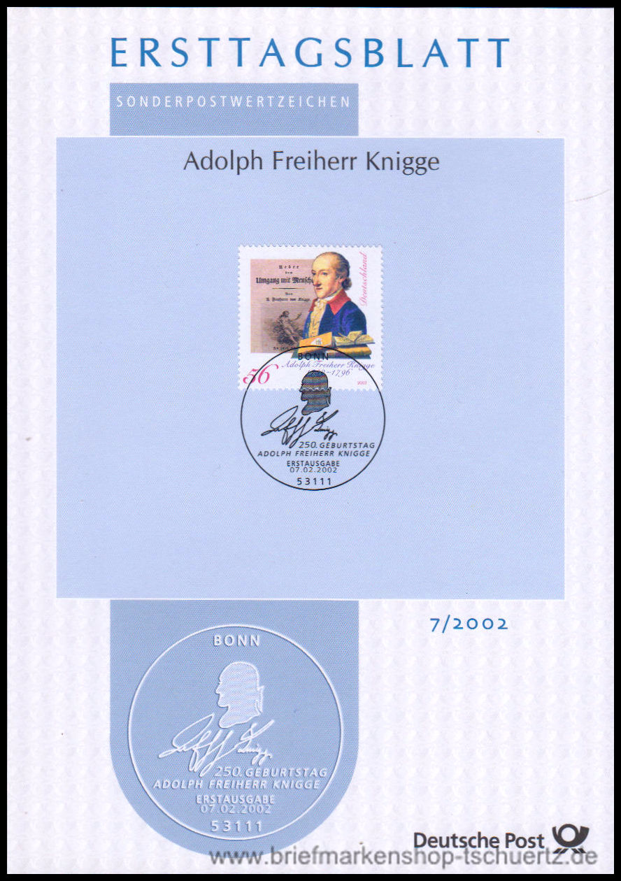 2002, 250. Geburtstag von Adolph Freiherr von Knigge Ersttagsblatt
