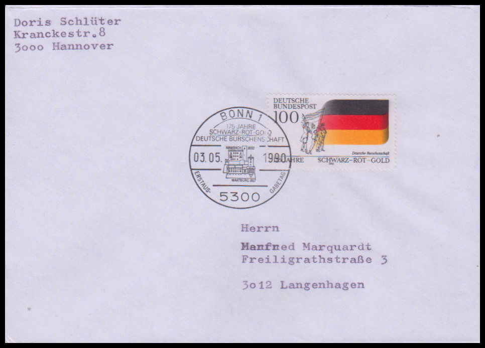 1990, 175 Jahre Nationalfarben Schwarz-Rot-GoldErsttagsbrief