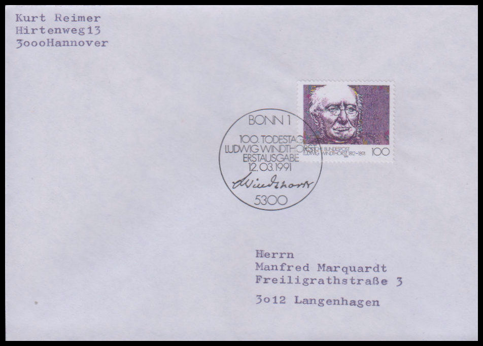 1991, 100. Todestag von Ludwig WindthorstErsttagsbrief