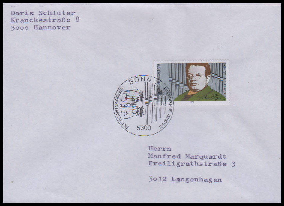 1991, 75. Todestag von Max RegerErsttagsbrief