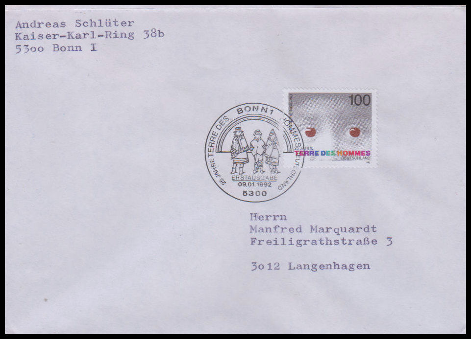 1992, 25 Jahre Kinderhilfsorganisation "Terre des Hommes Deutschland"Ersttagsbrief