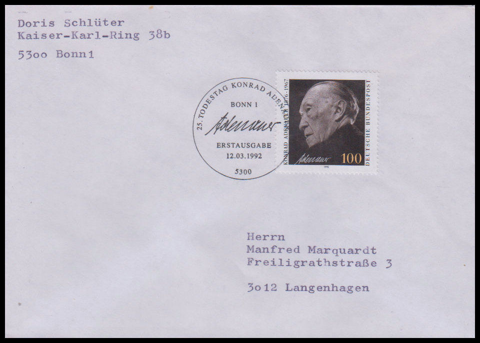 1992, 25. Todestag von Konrad AdenauerErsttagsbrief