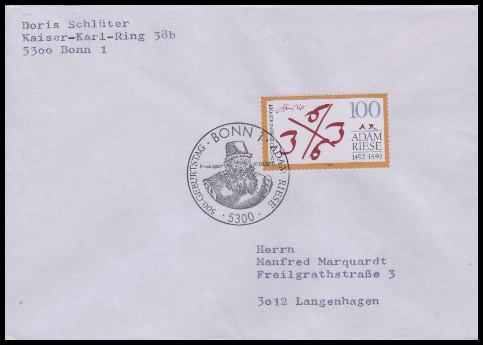 1992, 500. Geburtstag von Adam RieseErsttagsbrief