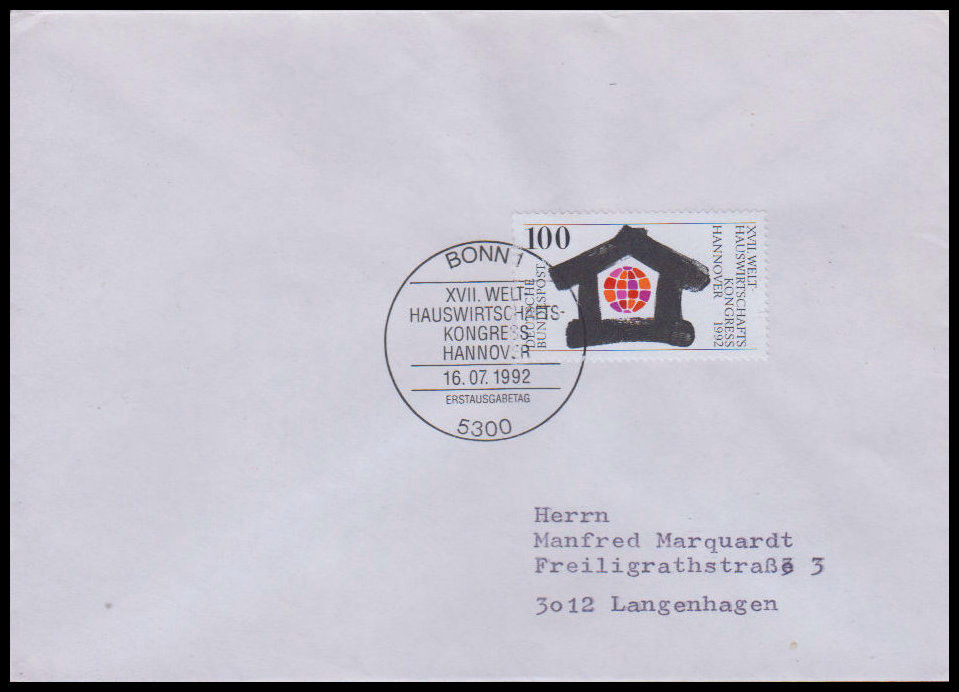1992, Welthauswirtschaftskongress HannoverErsttagsbrief