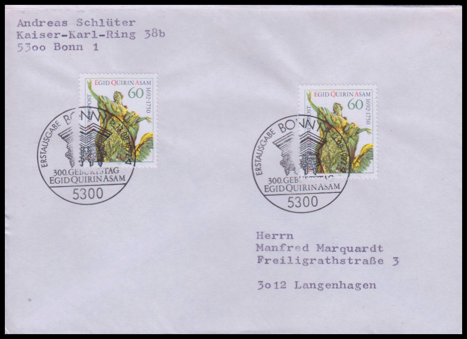 1992, 300. Geburtstag von Egid Quirin Asam Ersttagsbrief