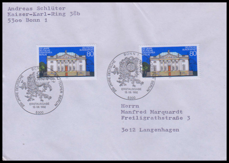 1992, 250 Jahre Deutsche Staatsoper, Berlin Ersttagsbrief