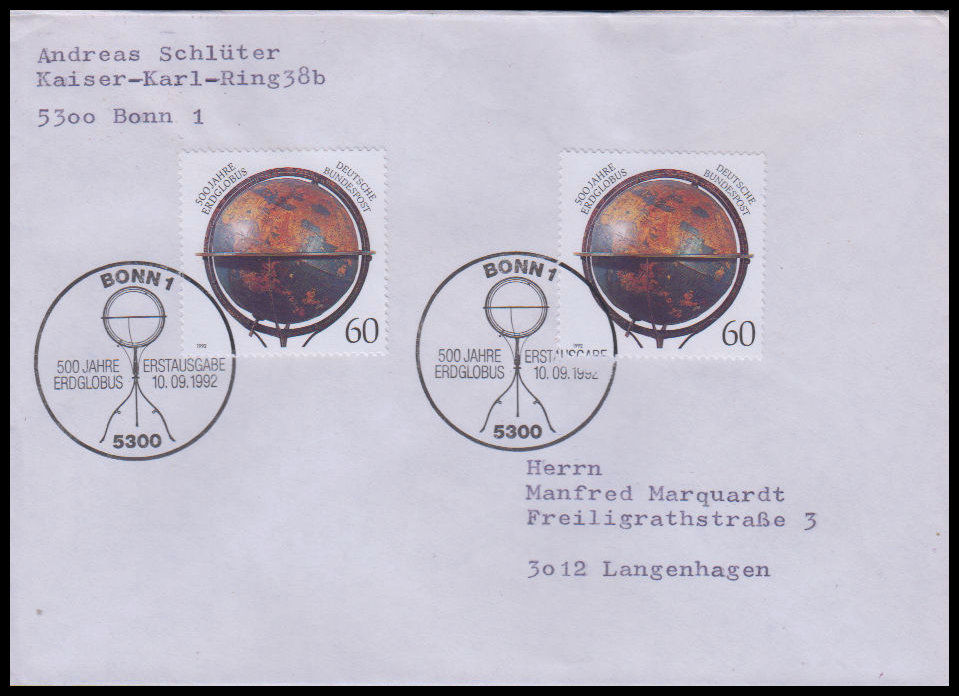 1992, 500 Jahre Erdglobus Ersttagsbrief
