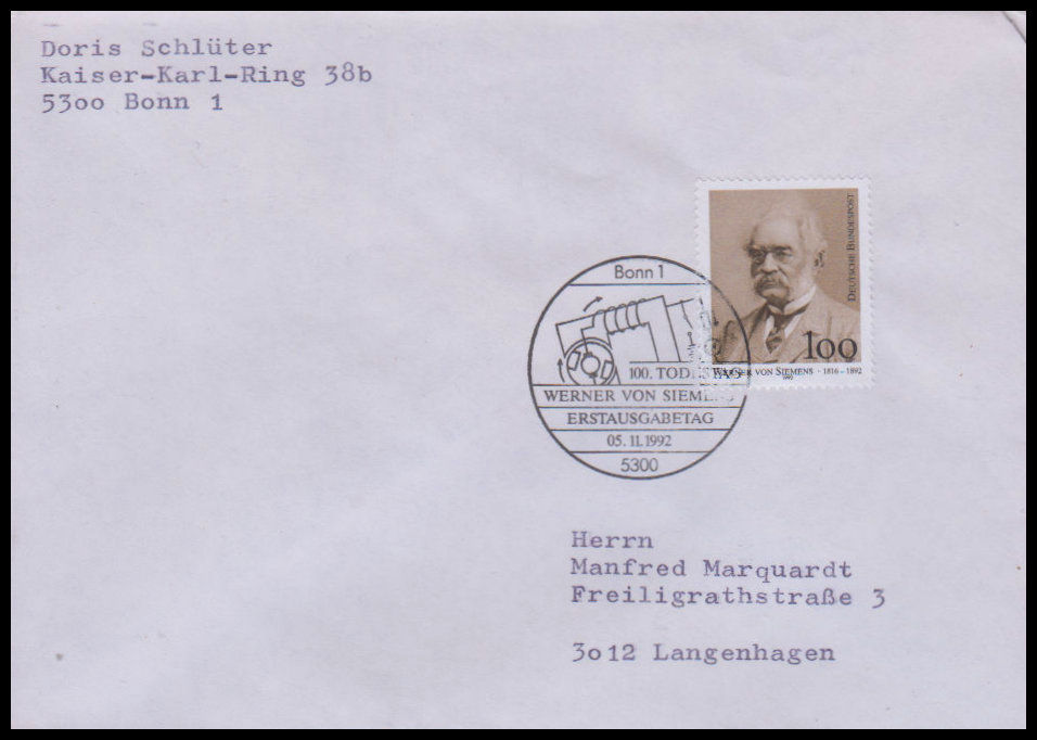 1992, 100. Todestag von Werner von SiemensErsttagsbrief