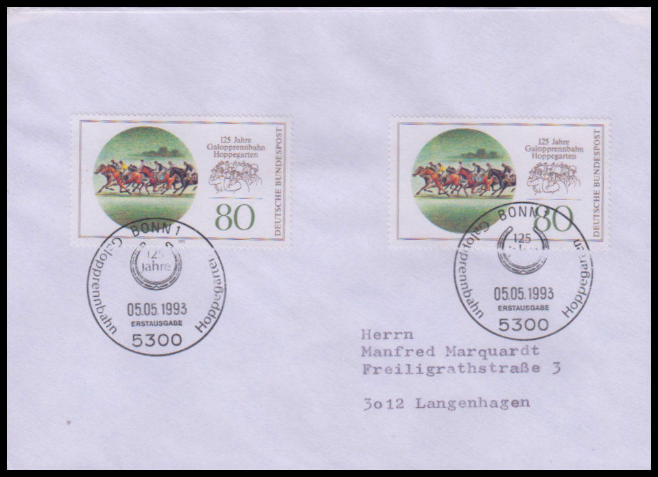 1993, 125 Jahre Galopprennbahn Hoppegarten bei BerlinErsttagsbrief