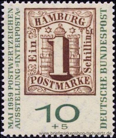 1959, Postwertzeichen-Ausstellung INTERPOSTA10 + 5 (Pf) - Marke Hamburg MiNr. 2 dunkelgrün / siena Einzelmarke, postfrisch
