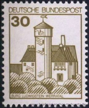1977, Freimarken: Burgen und Schlösser30 (Pf) - Burg Ludwigstein, Werratal-------------------------------------------------------------------Alte Fluoreszenz, Buchdruckmit gerader NummerRollengröße: 300 -------------------------------------------------------------------Rollenmarke mit rückseitiger Nummer, postfrisch