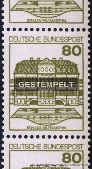 1982, Freimarken: Burgen und Schlösser 80 (Pf) - Schloss Wilhelmstal-------------------------------------------------------------------Neue Fluoreszenz (Cartax)mit ungerader NummerRollengröße: 500-------------------------------------------------------------------Rollenmarken, 3er-Streifen, gestempelt