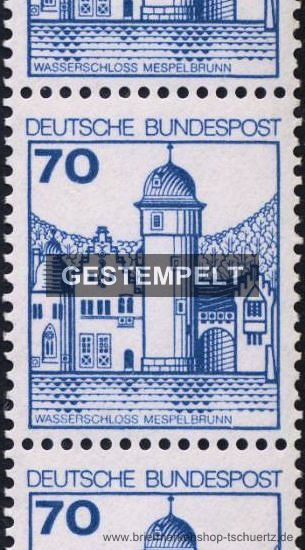 1977, Freimarken: Burgen und Schlösser 70 (Pf) - Wasserschloss Mespelbrunn-------------------------------------------------------------------Neue Fluoreszenz (Cartax)mit gerader NummerRollengröße: 500-------------------------------------------------------------------Rollenmarken, 3er-Streifen, gestempelt
