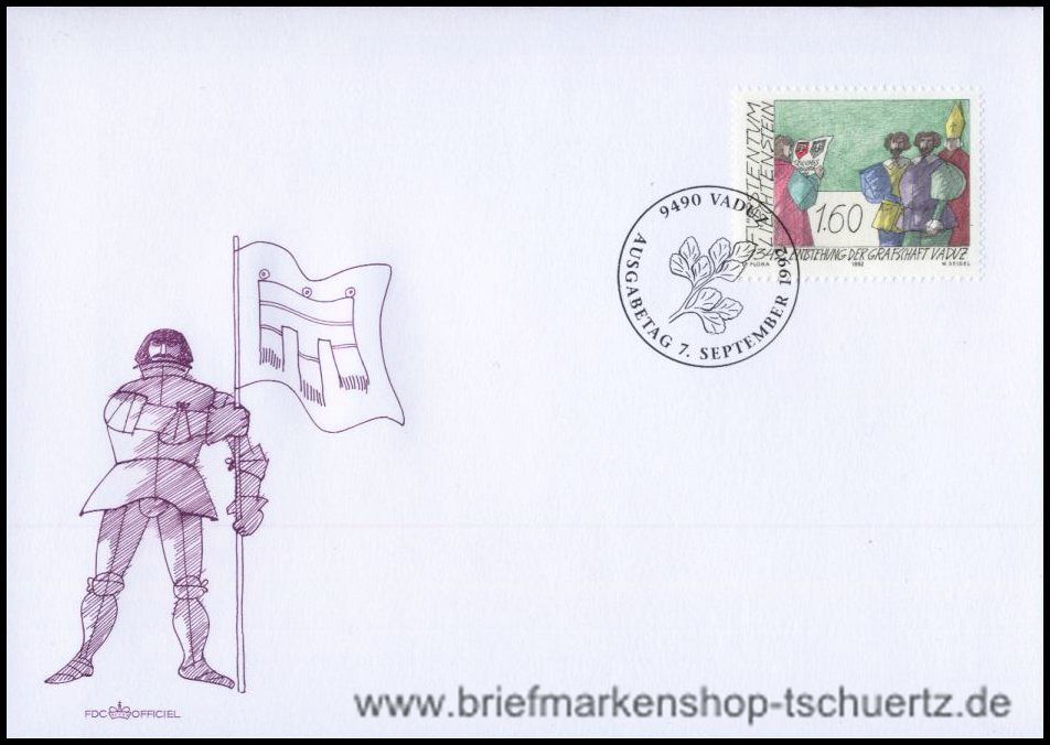 1992, 650 Jahre selbstständige Grafschaft VaduzOff. Ersttagsbrief mit Sonderstempel