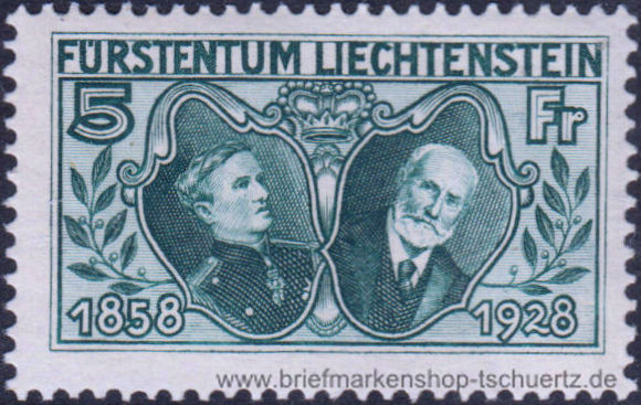 1928, Thronbesteigung von Fürst Johann II.5 Fr - Fürst Johann II. in den Jahren 1858 und 1928.Einzelmarke, ungebraucht mit Originalgummierung (Falz)