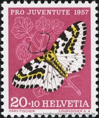 1957, Pro Juventute: Insekten20 (C) + 10 (C) - Stachelbeerspanner auf StachelbeereEinzelmarke, postfrisch