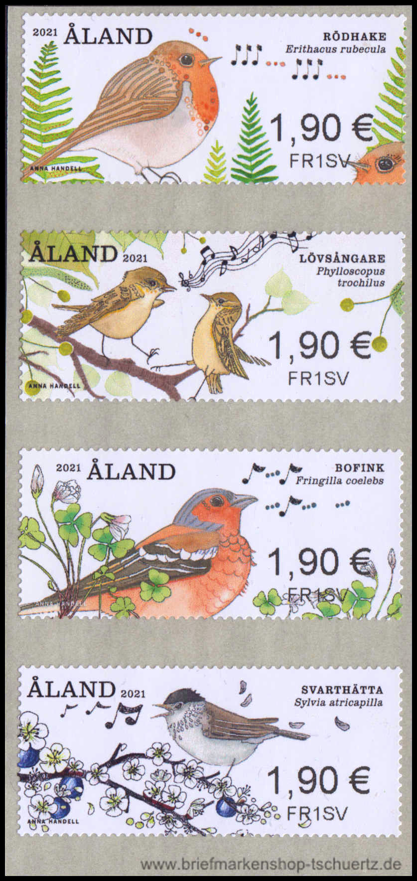 2021, Singvögelselbstklebend mit Nomialwert zu je 1,90 €Automatenmarken-Satz (4 W.), postfrisch