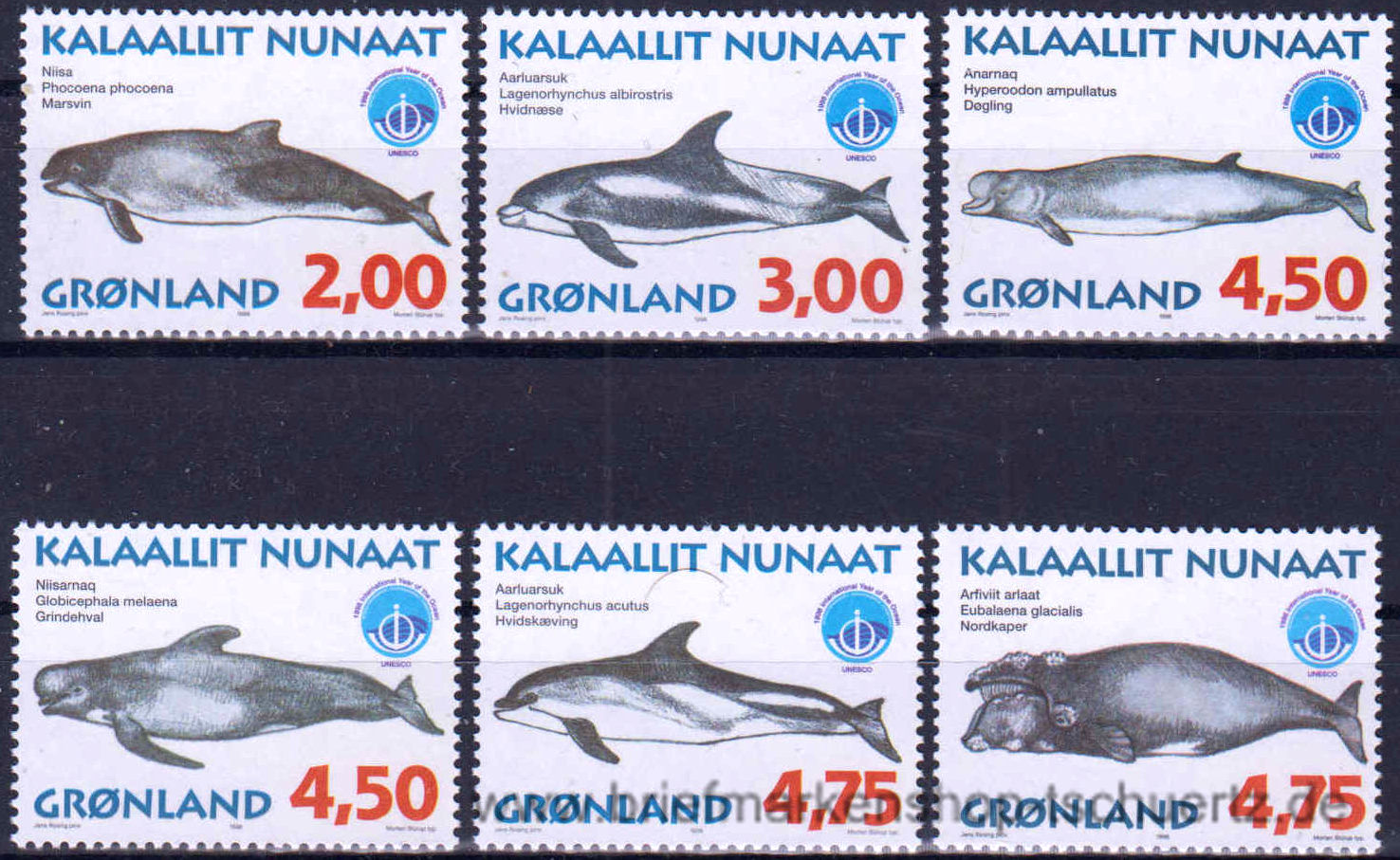 1998, Grönländische WalePapier fluoreszierendSatz (6 W.), postfrisch