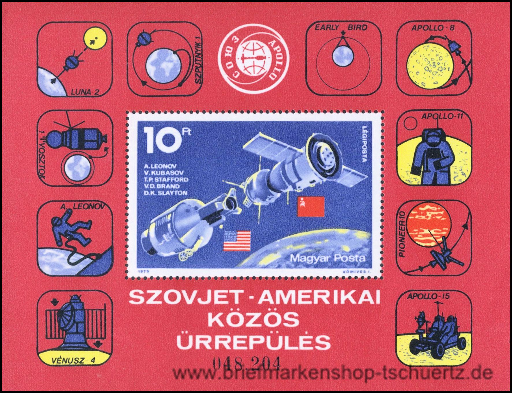 1975, Raumfahrtunternehmen Apollo-Sojus gezähntBlockausgabe, postfrisch