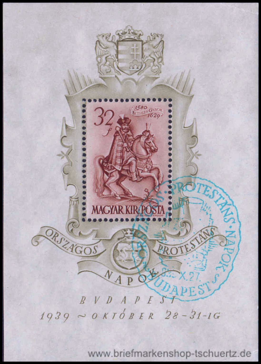 1939, Ausstellung Bethlen-Gabor-BundBlockausgabe, gestempeltAnmerkung: Kleiner Eckknick im oberen und unteren Blockrand