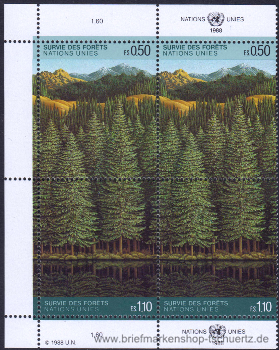 1988, Rettet den Wald Satz (2 W.), Eckrandviererblock links, postfrisch