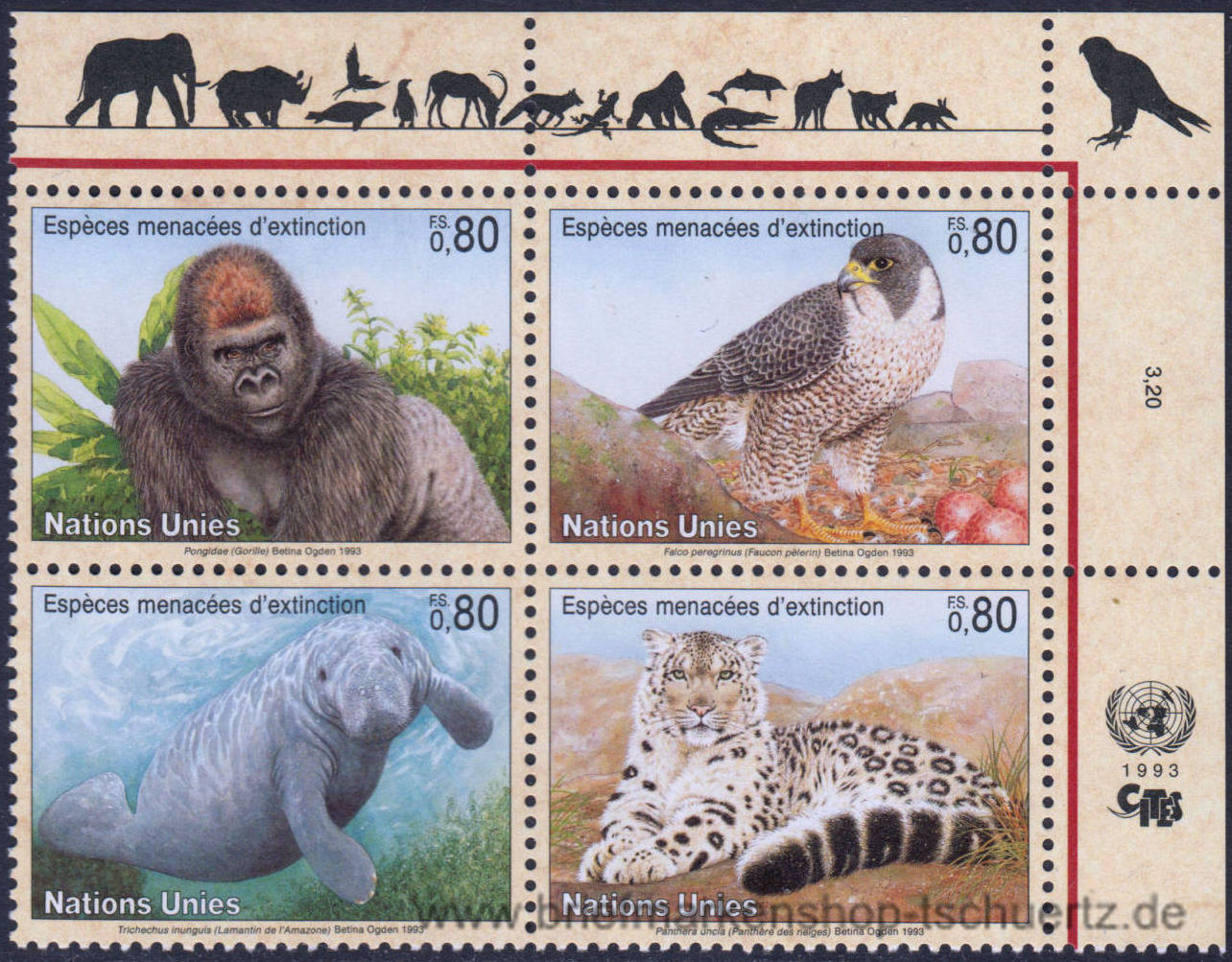 1993, Gefährdete Arten Satz (4 W.), Eckrandviererblock, postfrisch