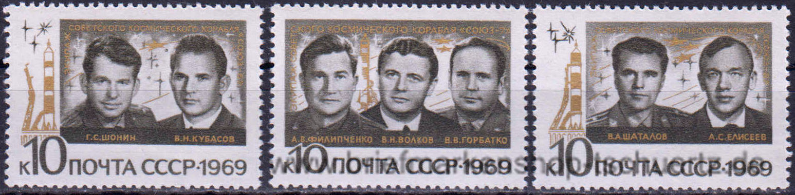 1969, Gruppenflug von Sojus 6, 7 und 8Satz (3 W.), postfrisch