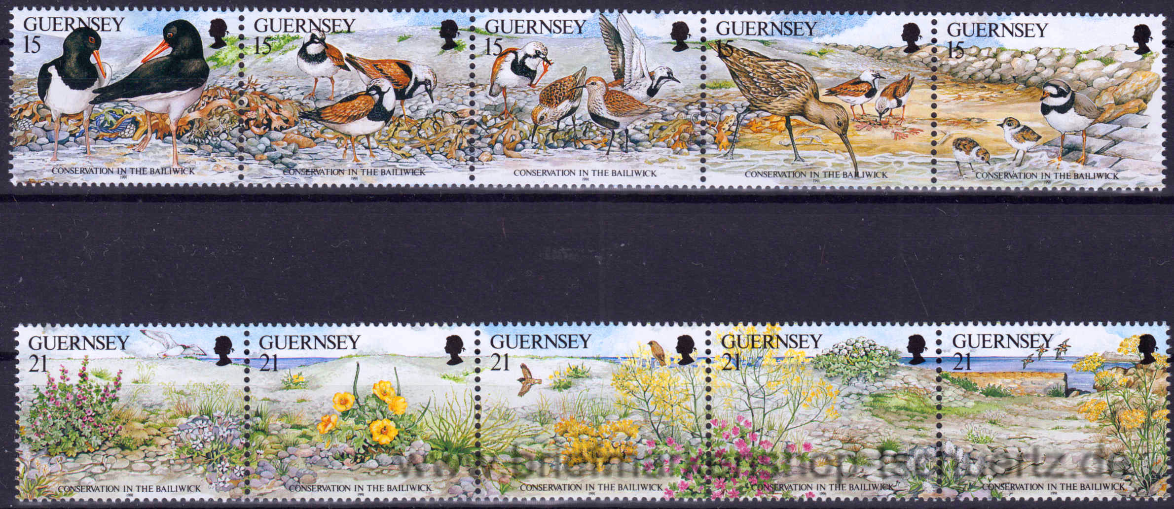 1991, Naturschutz auf GuernseySatz (10 W.), 2 Fünferstreifen, postfrisch